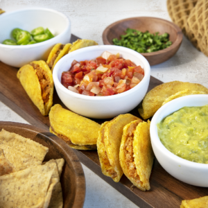 Our Chicken & Cheese Mini Tacos feature a crispy, oven-baked corn tortilla filled with seasoned chicken, real cheddar cheese, onions, and flavorful spices. These bite-sized tacos are packed with delicious chicken and cheese, making them the perfect match for your favorite queso or salsa dip!