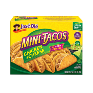 Our Chicken & Cheese Mini Tacos feature a crispy, oven-baked corn tortilla filled with seasoned chicken, real cheddar cheese, onions, and flavorful spices. These bite-sized tacos are packed with delicious chicken and cheese, making them the perfect match for your favorite queso or salsa dip!