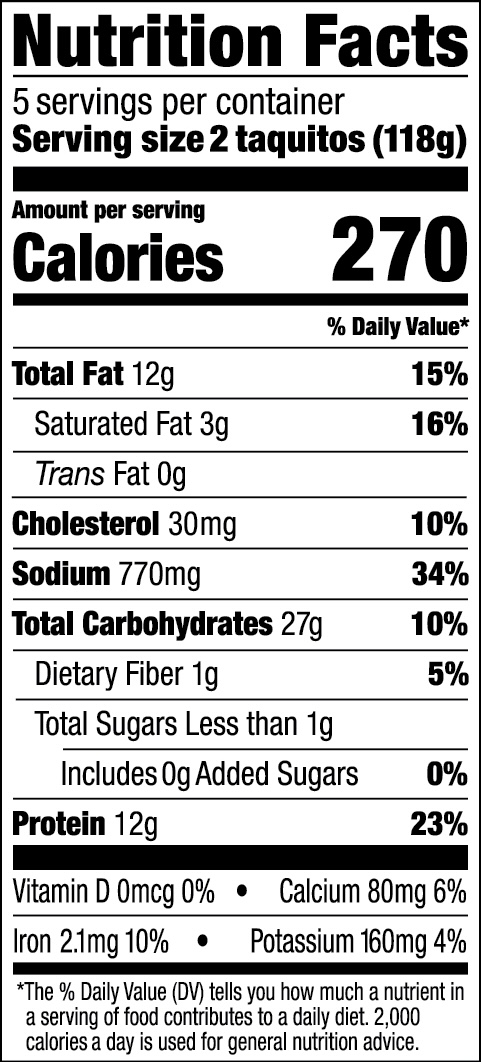 – When preparing 6 taquitos, increase heating time to 2:30 to 3 minutes.