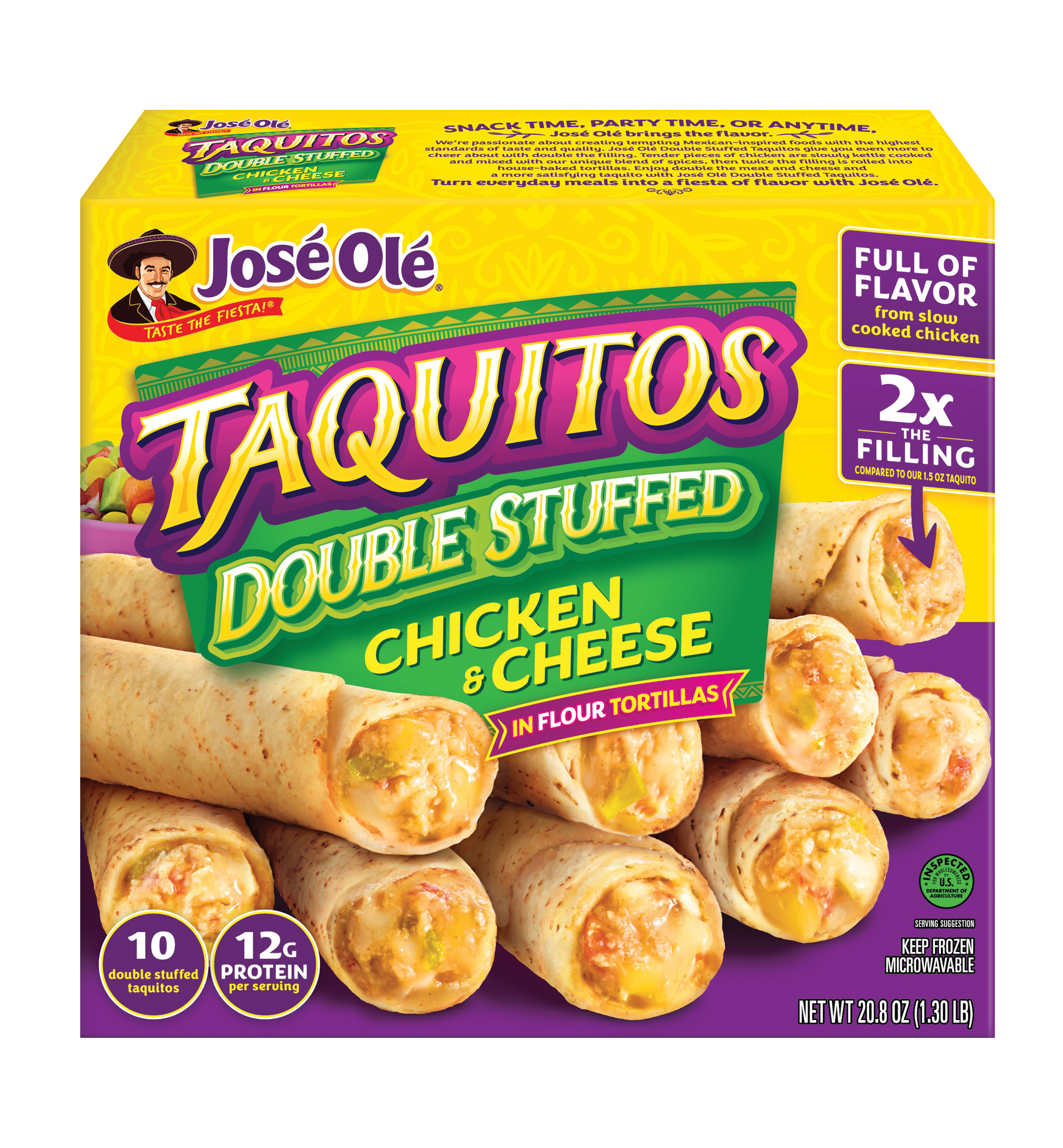 Our Double-Stuffed Chicken & Cheese Taquitos are loaded with juicy grilled chicken, melted cheddar cheese, onions, peppers, and flavorful seasonings, all packed into a crispy, oven-baked flour tortilla. These taquitos offer a bold blend of real ingredients and authentic flavors in every bite.